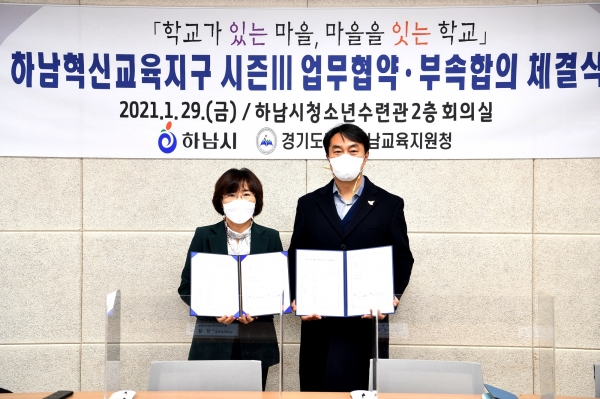 시는 지난 29일 하남시청소년수련관에서 김상호 시장과 한정숙 광주하남교육장이 참석한 가운데 경기도교육청과 서면 업무협약을 맺고 광주하남교육청과는 세부사업 운영을 위한 부속합의서를 체결했다고 밝혔다.