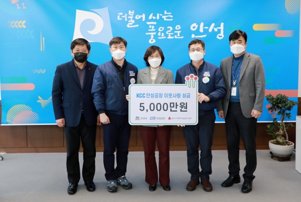 이에 김보라 안성시장은 “지역사회 나눔을 통해 행복한 세상을 만들어 가시는 ㈜KCC 안성공장 임직원 분들께 감사드리며 이웃들에게 희망과 사랑을 잘 전달하도록 하겠다”고 말했다.