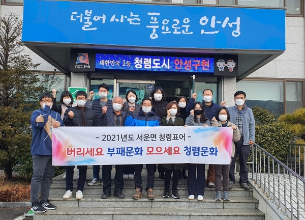 김건호 서운면장은 “코로나19 등으로 바쁜 업무 가운데도, 청렴표어 공모에 많은 관심을 가져준 직원들께 감사하다”며 “청렴은 공직생활 중 꼭 실천해야 할 덕목인 만큼, 직원들이 청렴의식 생활화를 위해 노력해 주길 바란다”고 말했다.