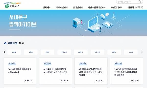 서대문구 홈페이지를 통해 편리하게 접속할 수 있으며 검색 기능을 활용하거나 축제, 문화, 청소년, 예산, 건강, 마을 등 40개 주요 키워드별로 자료를 찾을 수 있다.