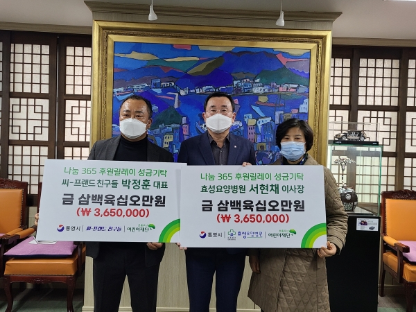 이날 후원 릴레이를 이어가는 기탁자는 용남면에 위치한 효성요양원 대표서현채 이사장과 산양읍 소재 낚시 전용선 운행업체를 운영하는 씨프랜드 박정훈 대표로 평소 어려운 이웃을 위한 선행에 앞장서고 있으며 특히 어린이를 위한 정기적인 기부를 하고 있던 중 나눔 365 후원릴레이에도 동참해 1년간 모은 기부금 365만원의 성금을 각각 전달했다.