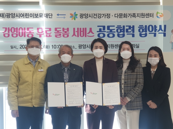 [피디언] 광양시어린이보육재단은 지난 2일 광양시육아종합지원센터 다목적실에서 광양시 건강가정·다문화가족지원센터와 ‘질병감염 아동 무료돌봄 서비스’를 위한 업무제휴 협약을 체결했다.