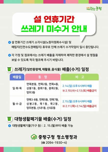 류경기 중랑구청장은 “소각시설 휴무와 코로나 관련 고향방문 자제로 작년 대비 쓰레기 배출 증가가 불가피해 많은 불편이 예상되지만, 구는 주민불편 예방 및 해소를 위해 최선을 다할 것”이라며 “주민 여러분께서도 쓰레기발생을 최소화하고 발생한 쓰레기는 가정·점포 내에 임시 보관하는 등 배출자제와 배출일정 준수를 부탁드린다”고 말했다.
