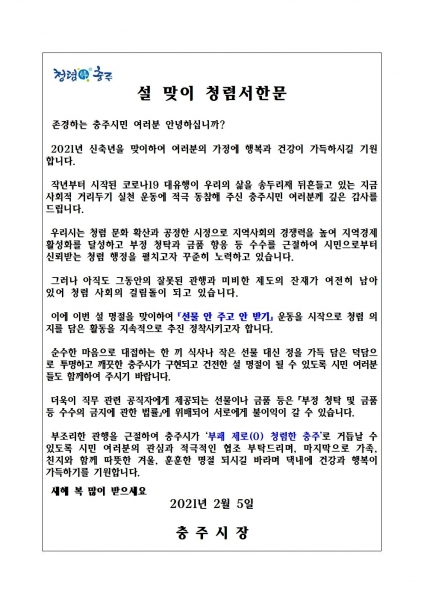 조길형 충주시장은 “청렴문화조성은 내가 하는 작은 실천에서 시작됨을 인지하고 설 명절 분위기에 편승해 선물을 주고받는 대신 정과 마음이 담긴 덕담으로 즐거운 설 명절을 보내시길 바란다”며 “앞으로도 충주시가 깨끗하고 청렴한 시로 정착할 수 있도록 공직자와 시민이 함께 노력해줄 것”을 당부했다.