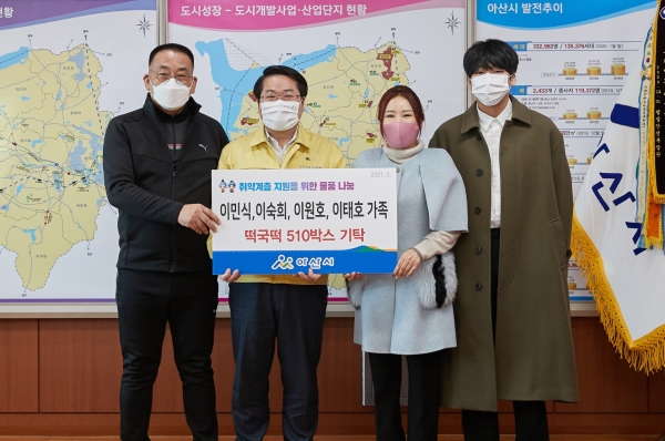 [한국Q뉴스] 이민식·이숙희·이원호·이태호 가족이 4일 아산시를 방문해 취약계층 지원을 위한 떡국 떡 510상자를 전달했다.