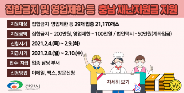 박상돈 천안시장은 “천안시가 105억원을 부담해 지원하는 이번 재난지원금이 코로나19로 생계에 어려움을 겪고 있는 시민들에게 조금이나마 도움이 되길 바란다”며 “신속한 지원금 지급을 위해 모든 행정력을 기울이겠다”고 말했다.