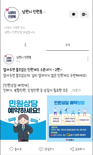 남원시 민원과장은 “카카오톡 채널 남원시 민원톡은 시민들의 민원·제증명 관련 문의사항을 다양한 문자와 이미지로 전달할 수 있어 효율적인 서비스로 시민 여러분의 많은 관심과 이용을 부탁드린다”고 말했다.