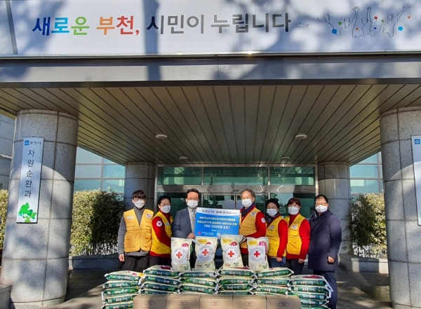 [한국Q뉴스] 부천시 자원순환과는 지난 4일 대한적십자사봉사회 부천지구협의회로부터 복사골 부천 ‘사랑의 쌀’ 50포를 전달받아 재활용품선별장 근로자들에게 전달했다고 밝혔다.