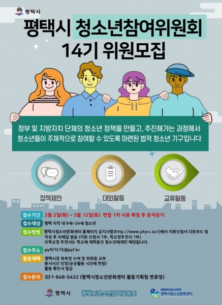 [한국Q뉴스] 평택시 위탁기관인 평택시청소년문화센터는 관내 9세부터 24세 청소년을 대상으로 ‘평택시 청소년참여위원회 14기’ 위원을 모집한다.