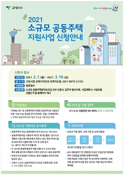 [한국Q뉴스] 고양시가 ‘2021년 소규모 공동주택 관리업무 보조금 지원 사업’의 신청 접수를 다음달 19일까지 받는다.