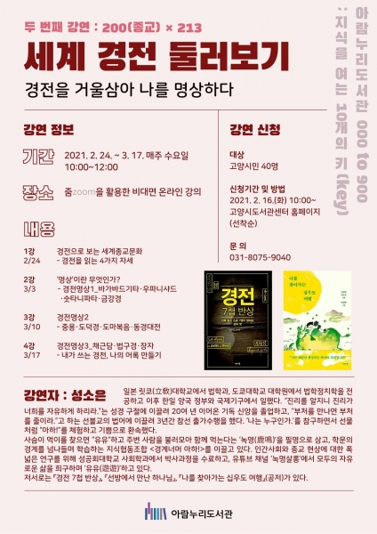 한편 고양시 아람누리도서관의 기획프로그램 ‘000 to 900)’는 이번 종교 편 강연을 시작으로 3월에는 ‘독서모임의 모든 것’, ‘퇴계 선생의 마음 닦는 법’을 진행할 예정이다.