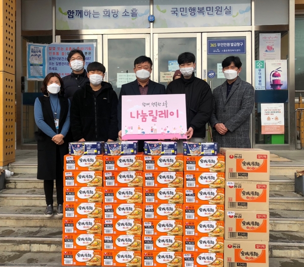 [한국Q뉴스] 소흘읍행정복지센터는 지난 5일 한국체대 킴스태권도 학원에서 소흘읍 저소득층을 위해 라면 80박스를 기탁했다고 전했다.
