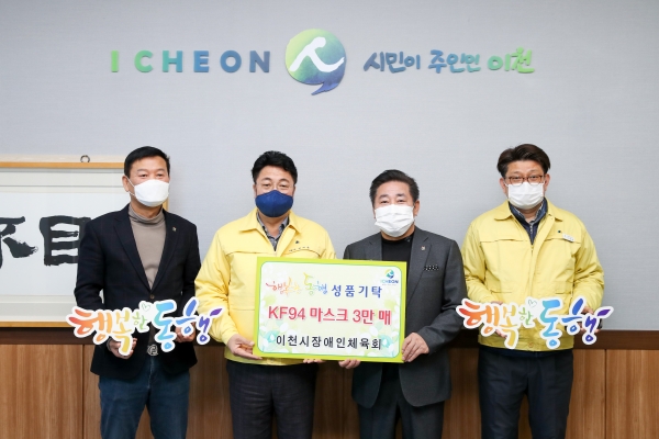 [한국Q뉴스] 지난 4일 이천시장애인체육회에서 이천시청을 방문해 저소득층을 위한 KF94마스크 3만 매를 기탁했다.