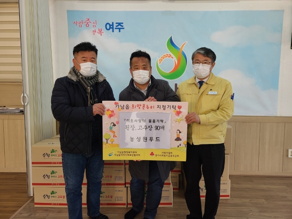 기탁된 된장, 고추장 선물세트와 고춧가루는 명예사회복지공무원으로 위촉된 가남읍 새마을부녀회의 행복드림단이 각 마을 어려운 가정에 배부할 예정이다.