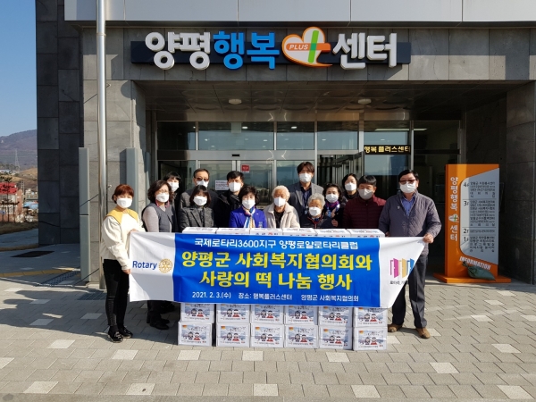 [한국Q뉴스] 양평로얄 로타리 클럽과 양평군 사회복지협의회은 지난 3일 코로나19 장기화로 어려운 상황임에도 설명절을 앞두고 이웃의 사랑을 실천하기 위해 사랑의 떡 나눔행사를 가졌다.