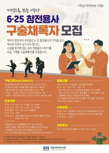 [한국Q뉴스] 하남시미사도서관은 6·25 전쟁을 겪은 참전용사의 삶을 기록하는‘6·25 참전용사 구술 채록’ 프로그램을 진행한다고 8일 밝혔다.