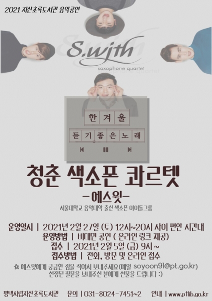 [한국Q뉴스] 평택시립지산초록도서관에서는 코로나19의 장기화로 인해 지친 시민들을 위로하기 위한 힐링 음악공연 ‘청춘 색소폰 콰르텟’을 준비했다.