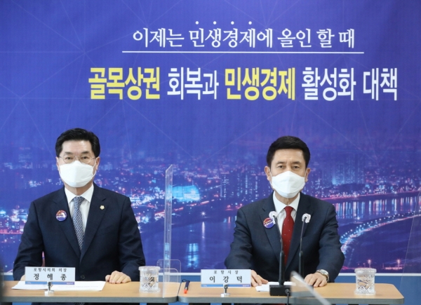 이날 이강덕 포항시장은 지난 해부터 타 지자체보다 강화된 사회적 거리두기 시행에도 불구하고 인터콥 등으로 지역 내 n차 감염이 지속적으로 발생함에 따라 코로나19 강력 대응을 위해 전국 지자체 최초 ‘1세대 1인 코로나19 검사 행정명령’으로 사회·경제적 피해 예방에 선제적인 방역 활동을 전개해 감염 확산을 차단한 큰 성과를 거두었으며 후속조치로 비상경제 방역을 위한 ‘민생경제 부활의 경제 대전환 대책’에 총력을 펼친다는 계획을 밝혔으며 이 자리에 함께한 정해종 포항시의회 의장은 코로나19로 장기화되고 있는 지역 경제 부양을 위해 의회 차원에서 대응에 함께한다는 의지를 담았다.