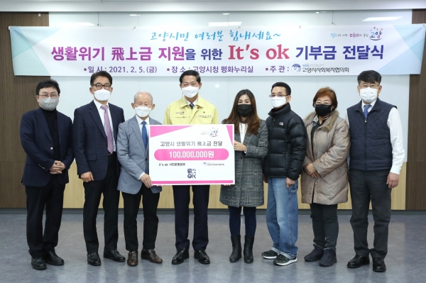 [한국Q뉴스] 고양시(시장 이재준)는 지난 5일 It’s ok 시민운동본부와 여러 단체·기관에서 기부캠페인으로 모금한 ‘고양시 생활위기 비상(飛上)금’ 1억원의 전달식을 개최했다고 밝혔다.