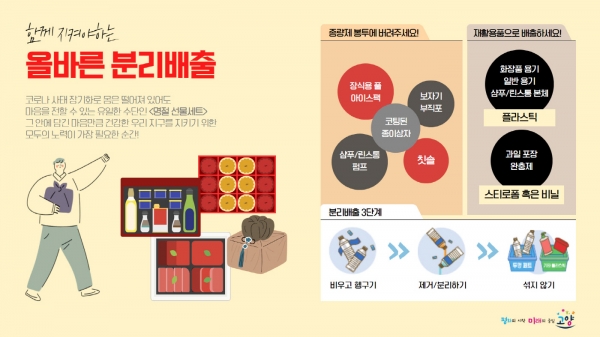 명절 선물세트의 부직포, 코팅종이, 혼합물질 등은 재활용이 불가하므로 종량제 봉투에 버리고 과일포장 완충제는 스티로폼 혹은 비닐로 분리해 배출하는 등 각 사례별 올바른 방법을 ‘내 손안의 분리배출 앱’을 통해 바로 확인, 실천할 수 있으니 많은 이용 바란다”고 당부했다.