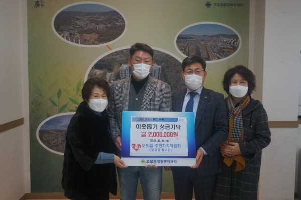 이에 대해 권용석 오포읍장은 “지속적으로 따뜻한 선행을 보여주신 황교진 위원장님 및 오포읍 주민자치위원회 여러분께 감사드린다”며 “소중한 성금이 어려운 시기를 함께 이겨 낼 큰 힘이 될 것”이라고 감사의 뜻을 전했다.