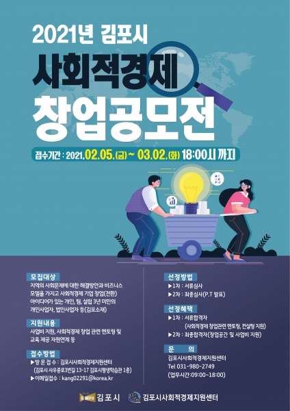 [한국Q뉴스] 김포시는 지역 사회 문제를 해결하고 취약계층의 일자리 창출, 사회서비스 제공 등의 사회적 가치에 중심을 둔 사회적경제기업을 발굴·육성하기 위한 ‘2021 사회적경제 창업 공모전’을 개최한다고 밝혔다.