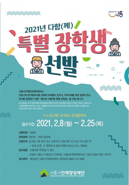 [한국Q뉴스] 시흥시인재양성재단이 코로나19 장기화로 경제적 어려움을 겪고 있는 시흥시민을 응원하기 위해 8일부터 ‘다함 특별 장학생’ 1,000명을 선발 모집한다.