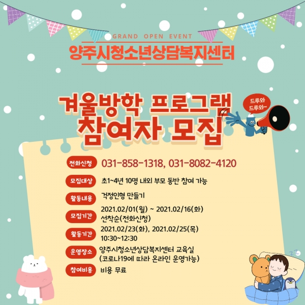 [한국Q뉴스] 양주시청소년상담복지센터는 오는 18일까지 1~4학년 초등학생들을 대상으로 ‘겨울방학 프로그램’참가자를 모집한다.