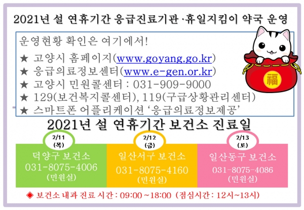 [한국Q뉴스] 고양시가 오는 11일부터 14일까지 설 연휴기간 시민들의 진료 편의를 위해 ‘응급진료상황실’을 운영해 진료 및 의약품 구입에 대한 불편을 최소화할 방침이라고 밝혔다.