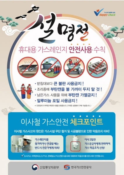 설 연휴기간 가스사용량 증가로 사고발생 개연성이 높아짐에 따라 가스 사고를 예방하기 위해서는 가정 내에서 휴대용 가스레인지 사용 시 받침대보다 큰 불판 사용금지 조리 중 부탄캔을 불 가까이 두지 말 것 남은가스 사용을 위해 부탄캔 가열금지 알루미늄 포일 사용금지 등의 기본적인 안전수칙을 꼭 준수해야 한다.