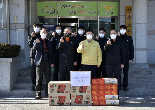 [한국Q뉴스] 장수군은 설 명절을 맞아 무진장소방서와 장수경찰서를 방문해 지역 안전을 위해 힘쓰고 있는 의무경찰·의무소방대원들에 위문 물품을 전달했다.