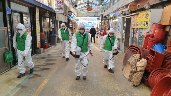 자율방재단은 설 연휴를 앞두고 이용객 급증이 예상되는 상설시장을 찾아 사회적 거리두기 지침을 준수하며 자동 분무 소독기를 이용해 전통시장의 점포와 통로 및 화장실 등 곳곳에 일제 방역을 펼쳤다.