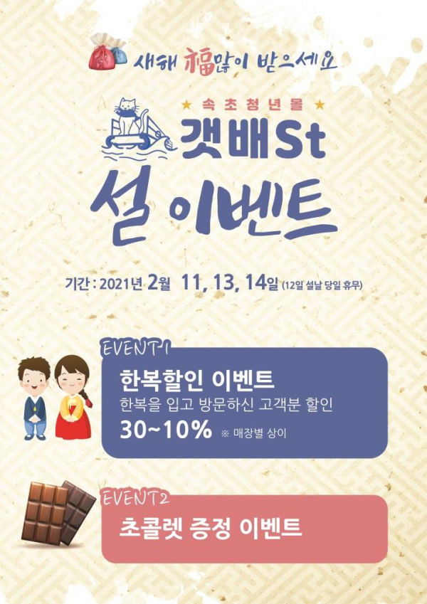 설 명절과 밸런타인데이를 맞이해 2월 11일부터 14일까지 한복을 입고 청년몰“갯배St”를 찾는 고객을 대상으로 10 ~ 30% 할인 행사와 함께 초콜릿, 마스크, 머그컵 등 선물을 증정한다.