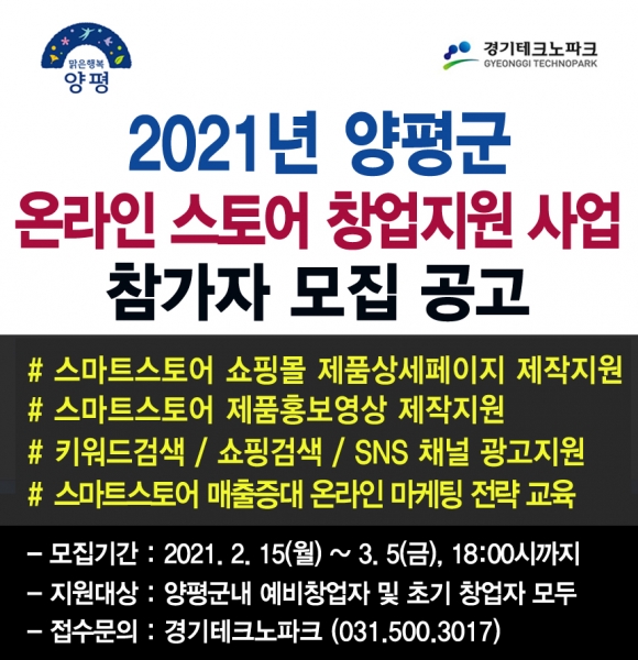 [한국Q뉴스] 양평군에서는 관내 중·소상공인 기업 중 성장잠재력이 높은 20개의 기업을 선발해 온라인 마케팅 교육 및 맞춤형 컨설팅 지원 등 온라인 스토어 창업을 위한 지원을 추진한다.