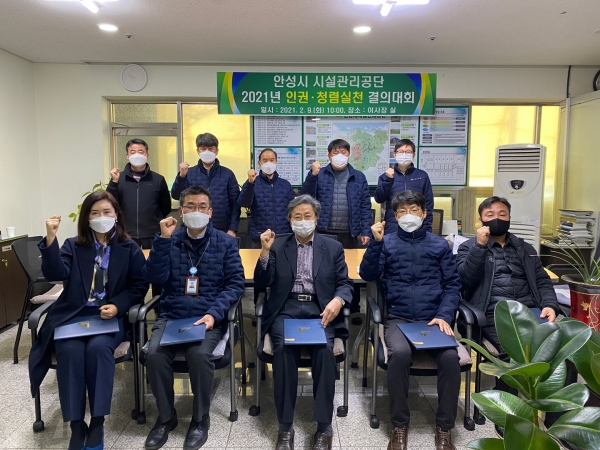 [한국Q뉴스] 안성시시설관리공단은 공단의 모든 이해관계자에 대한 인권존중 및 청렴문화 확산을 위해 지난 9일 이사장실에서 팀장급 이상 경영진을 대상으로 ‘2021년 인권·청렴실천 결의대회’를 개최했다고 밝혔다.