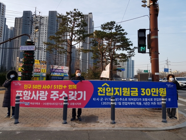 이 캠페인은 지난 1월 25일부터 시작해 7회째 계속되고 있으며 특히 타 시군구에 1년 이상 주소를 두고 있다가 포항시로 전입한 시민들에게 전입신고 1개월 후에 30만원을 포항사랑상품권으로 지급하는 주소이전 지원금에 대해 홍보활동을 펼쳤다.