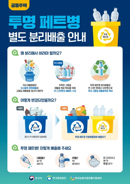 환경부의 ‘재활용가능자원의 분리수거 등에 관한 지침’ 개정에 따라 지난해 12월 25일부터 공동주택에서는 투명페트병을 별도 배출해야 한다.