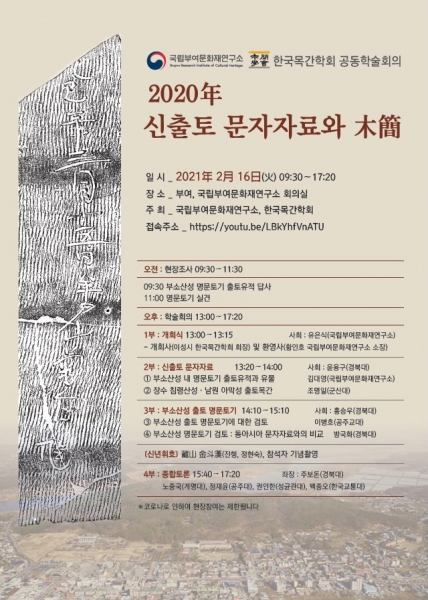 [한국Q뉴스] 문화재청 국립부여문화재연구소는 한국목간학회와 함께 16일 국립부여문화재연구소 회의실에서 ‘2020年 신출토 문자자료와 木簡’이라는 주제로 학술회의를 개최했다.