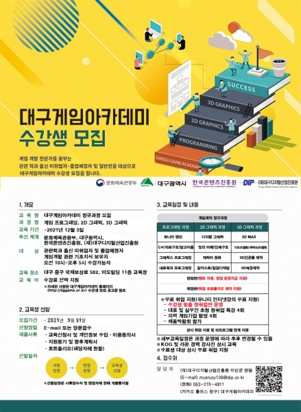 [한국Q뉴스] 대구시는 지역 게임산업 인력수급을 위한 전문인력 양성 및 청년 일자리의 창출을 위해 대구디지털산업진흥원 주관으로 대구게임아카데미의 수강생을 3월 31일까지 모집 중이다.