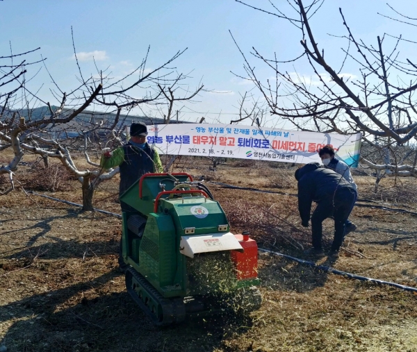 영농 잔재물을 불법으로 태우지 않고 잔가지 파쇄기로 파쇄해 퇴비화 하도록 마을단위 파쇄작업을 농기계 임대사업소에서 이틀간 지원·운영했다.
