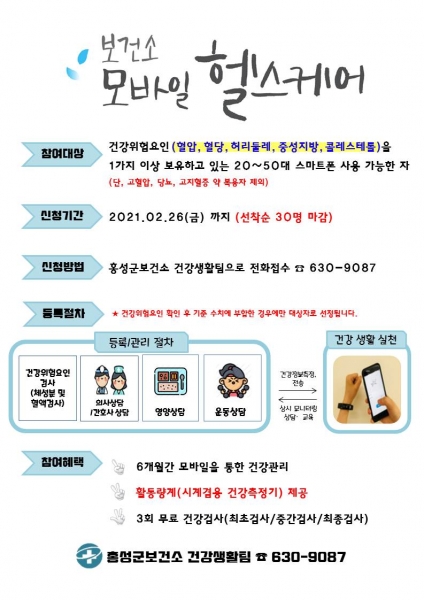 [한국Q뉴스] 홍성군보건소는 스마트폰을 통해 비대면으로 맞춤형 통합 건강관리서비스를 제공하는 모바일헬스케어 사업 참여자를 모집한다고 24일 밝혔다.