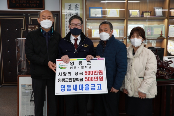 영동새마을금고는 24일 영동군청을 찾아 500만원의 장학금과 500만원의 이웃돕기성금 등 총1,000만원을 기탁했다.
