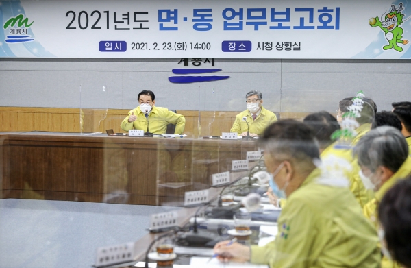 [한국Q뉴스] 계룡시는 지난 23일 시청 상황실에서 최홍묵 시장을 비롯한 부시장, 국장, 부서장, 면·동장, 관계 공무원 등 30여명이 참석한 가운데 2021년 면·동 주요업무 보고회를 가졌다.
