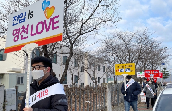 [한국Q뉴스] 영천시 기업유치과는 지난 25일 영천 남부동에 위치한 도남농공단지 내 영천시시설관리사업소 앞 사거리에서 ‘영천 인구 11만 달성’을 위한 영천 주소갖기 캠페인을 실시했다.