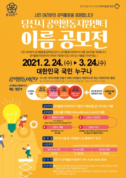 [한국Q뉴스] 당진시는 시민의 공익활동과 민관협치 지원을 위해 설립된 ‘당진시 공익활동지원센터’의 이름을 찾기 위한 공모전을 진행한다고 밝혔다.