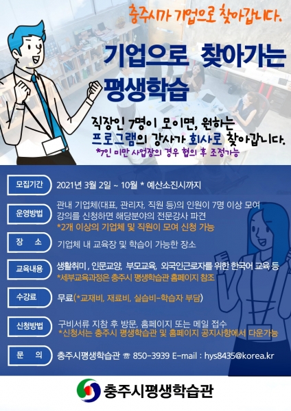 이번 사업은 3월 2일부터 기업체의 신청을 받아 국어교육, 부모교육, 직무역량 강화 등 다양한 분야의 과정들을 진행한다.