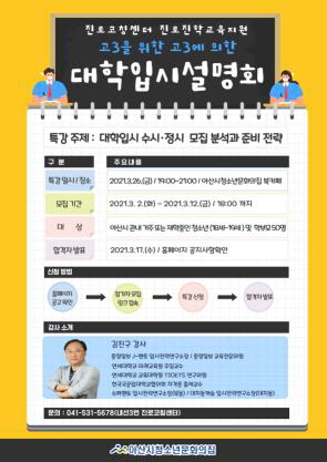 이번 대학입시설명회는 변화되는 대입정책에 대한 정보를 얻기 어려운 아산시 관내 18세~19세 청소년 및 학부모를 대상으로 50명을 선착순 모집할 예정이다.