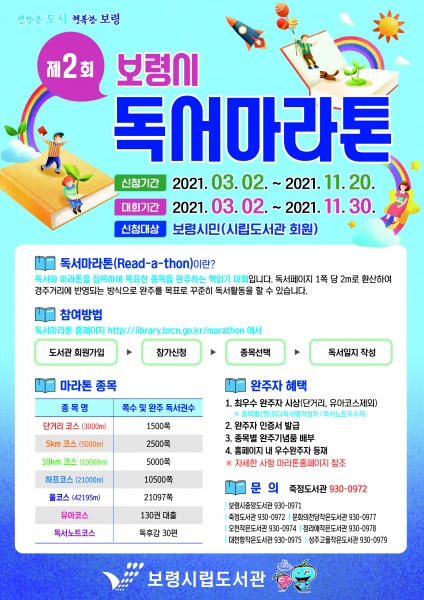 지난 2019년 12월에 처음 시작해 올해로 2회째를 맞는 보령시 독서마라톤대회는 독서와 마라톤을 접목시켜 책 1페이지를 2m로 환산해 자신이 목표로 정한 코스를 완주 후 독서마라톤대회 홈페이지에 독서평을 작성하는 범시민 독서 캠페인이다.