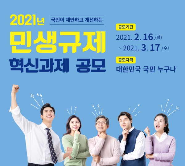 공모대상은 국민복지, 일상생활, 취업·일자리, 소상공인·중소기업 지원, 신산업분야 등 국민생활과 경제활동 전반을 아우르는 과도한 규제가 포함된다.