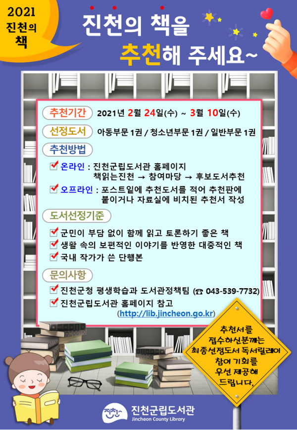 이번 추천은 진천군립도서관 홈페이지에서 온라인 접수를 하거나 진천군립·생거진천혁신도시·광혜원도서관을 방문해 추천⋅접수하면 된다.